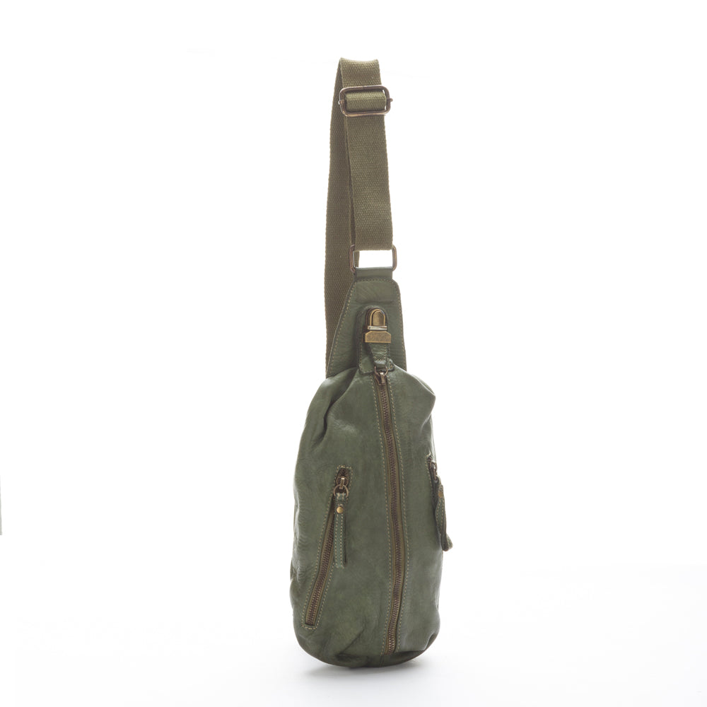 Unisex vintage sling bag made of soft calf leather washed and garment dyed, made in Italy. Zip fastening, double outside pocket with zip, inside pockets, adjustable belt. Size: 17l x 8d x 28h