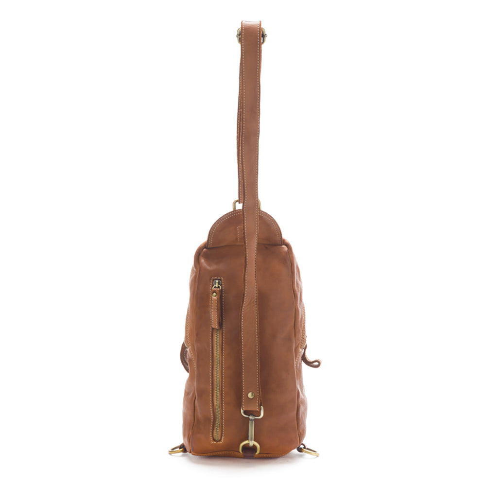 Unisex vintage sling bag made of soft vegetable tanned calf leather washed and garment dyed, made in Italy. Zip fastening, double outside pocket with zip, back pocket, inside pockets, adjustable belt. Size: 16l x 8d x 32h