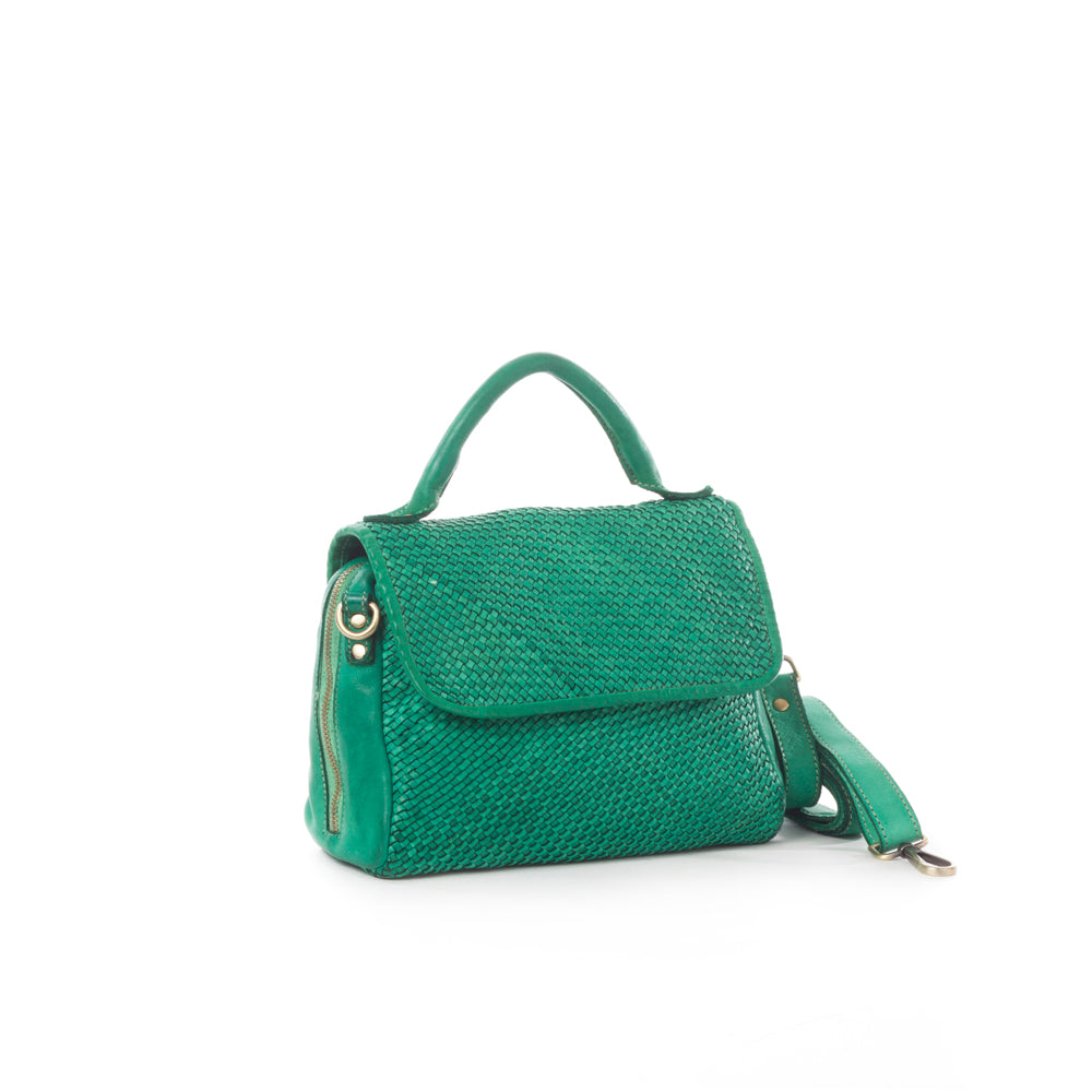 Borsa a tracolla vintage da donna realizzata in morbido vitello e pelle intrecciata a mano lavata e tinta in capo, made in Italy. Manico superiore, patta intrecciata, chiusura con clip e cerniera, tasche interne e tasca con zip, con tracolla regolabile.